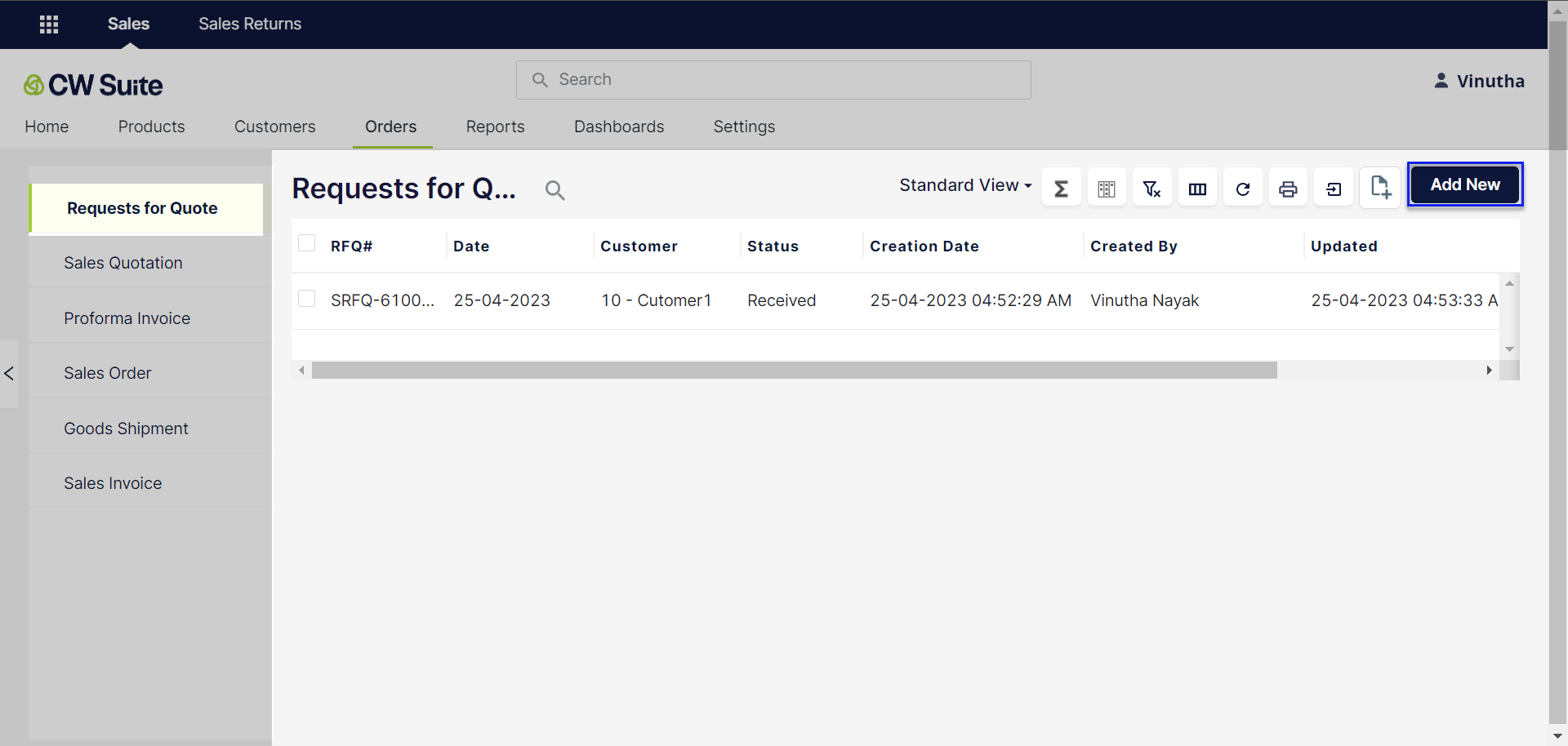 * Then, click on the Request for Quote button on the left side menu and click the Add New button.