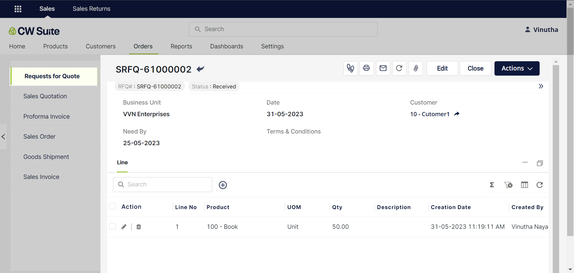 * To add products to the Request for Quote, go to the Lines section and enter the necessary product information. When finished, click on the Save button.