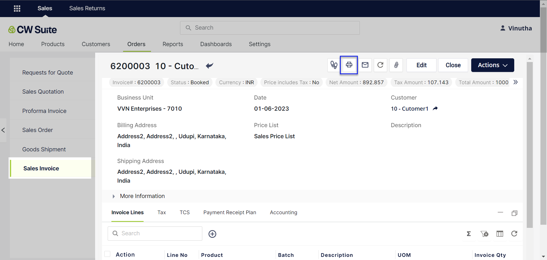 To print the sales invoice, click on the Print icon.