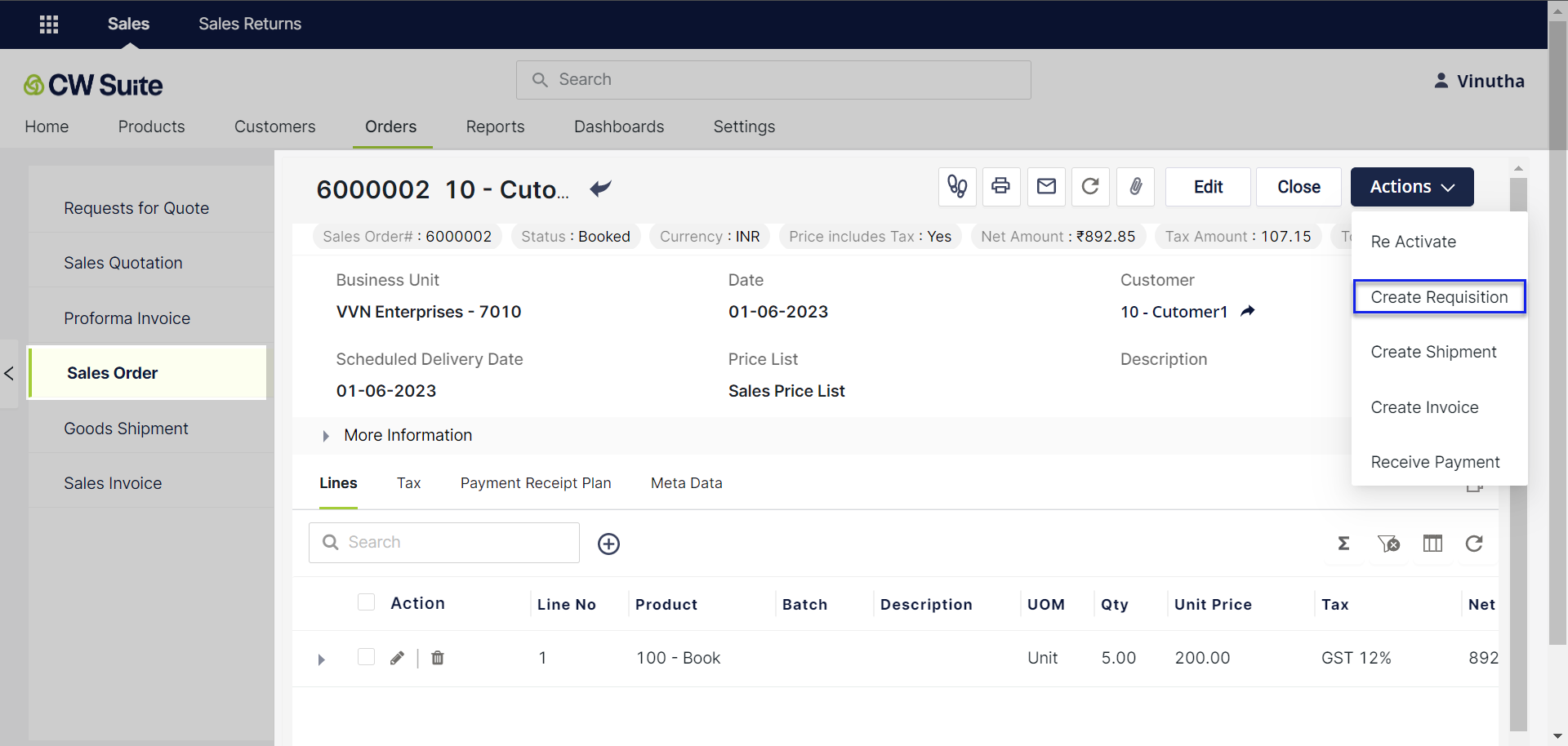 Then, click on Create Requisition to initiate the process of creating a requisition for the corresponding sales order