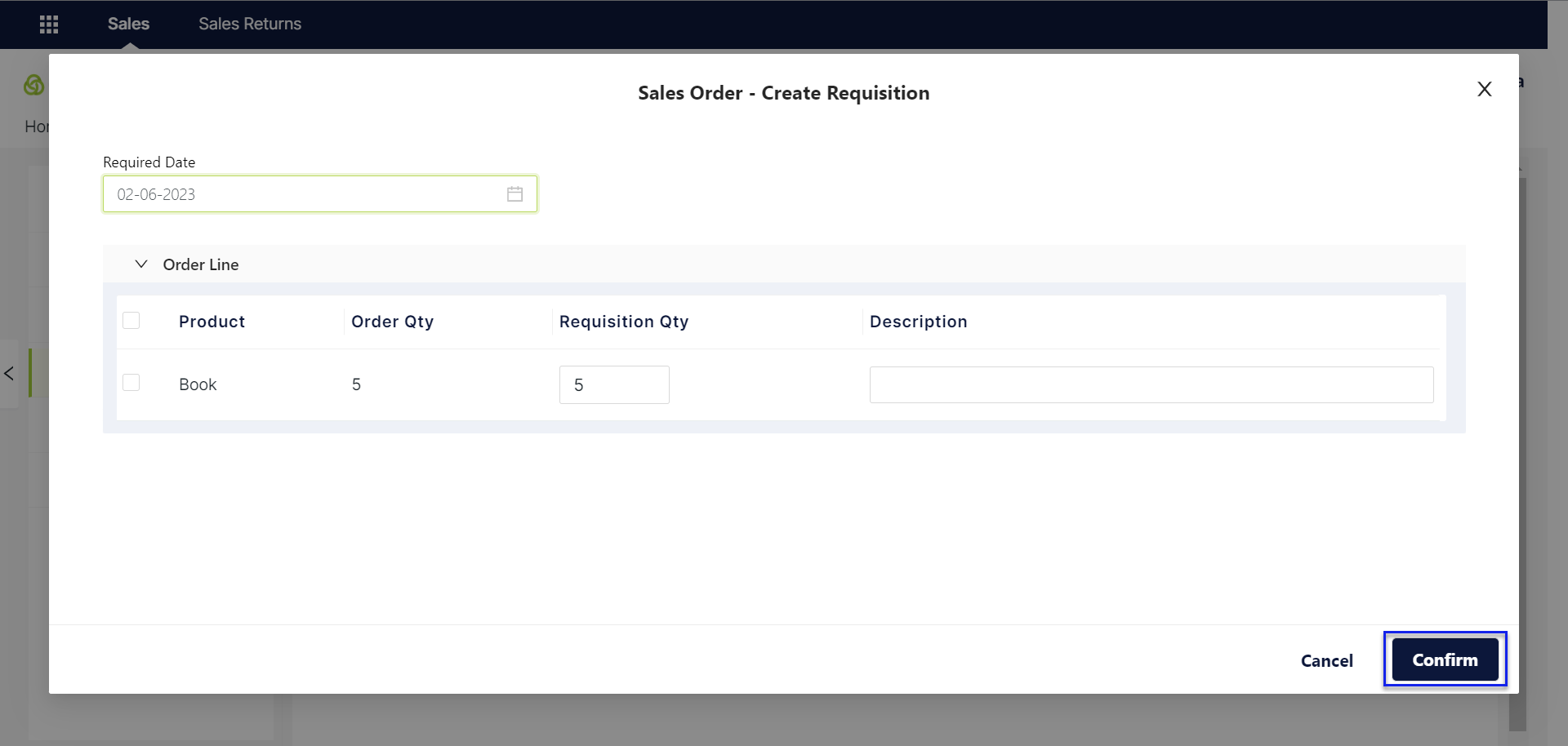 Enter the requisition quantity and then click on Confirm. This will create the requisition with the specified quantity.